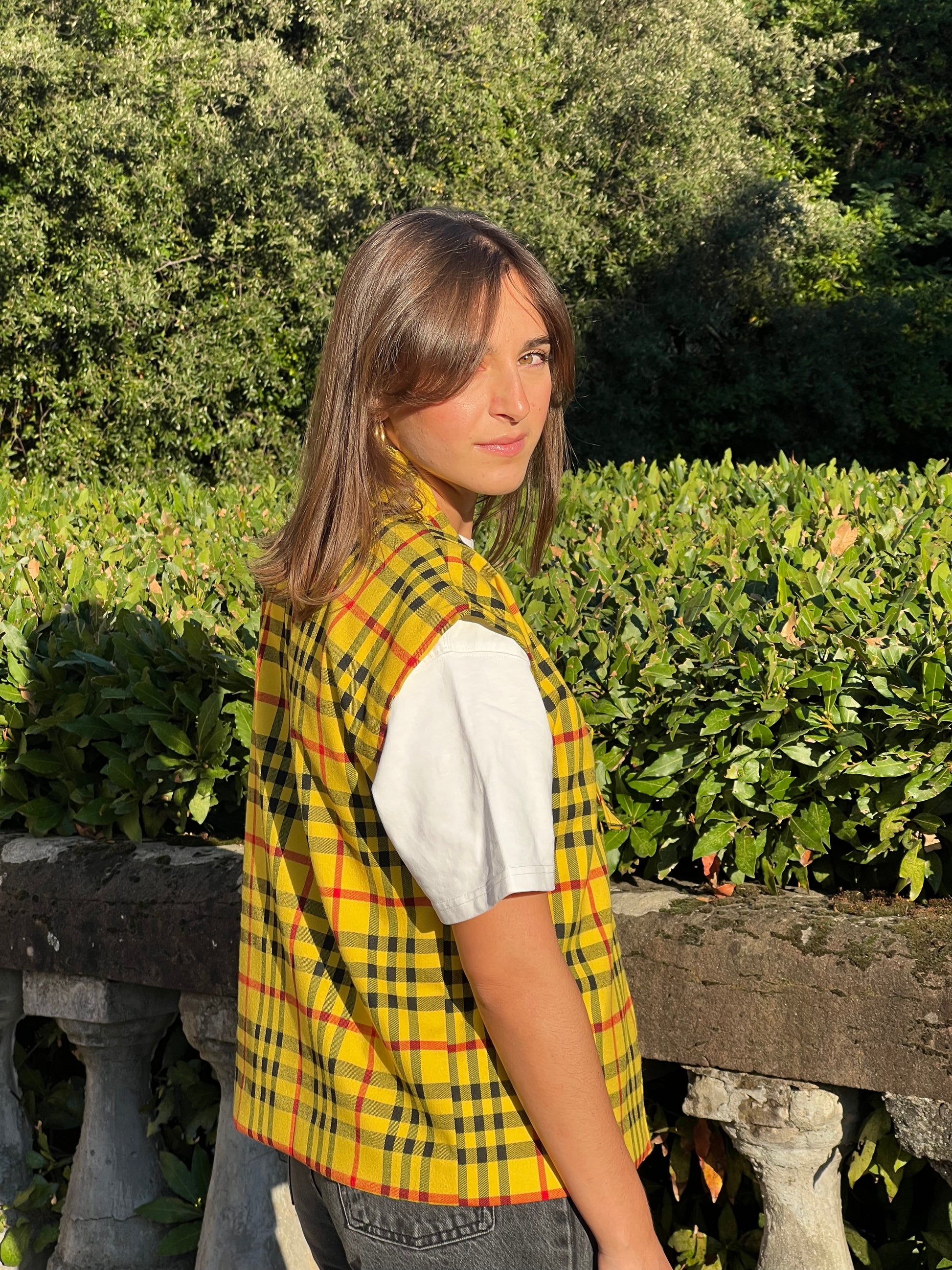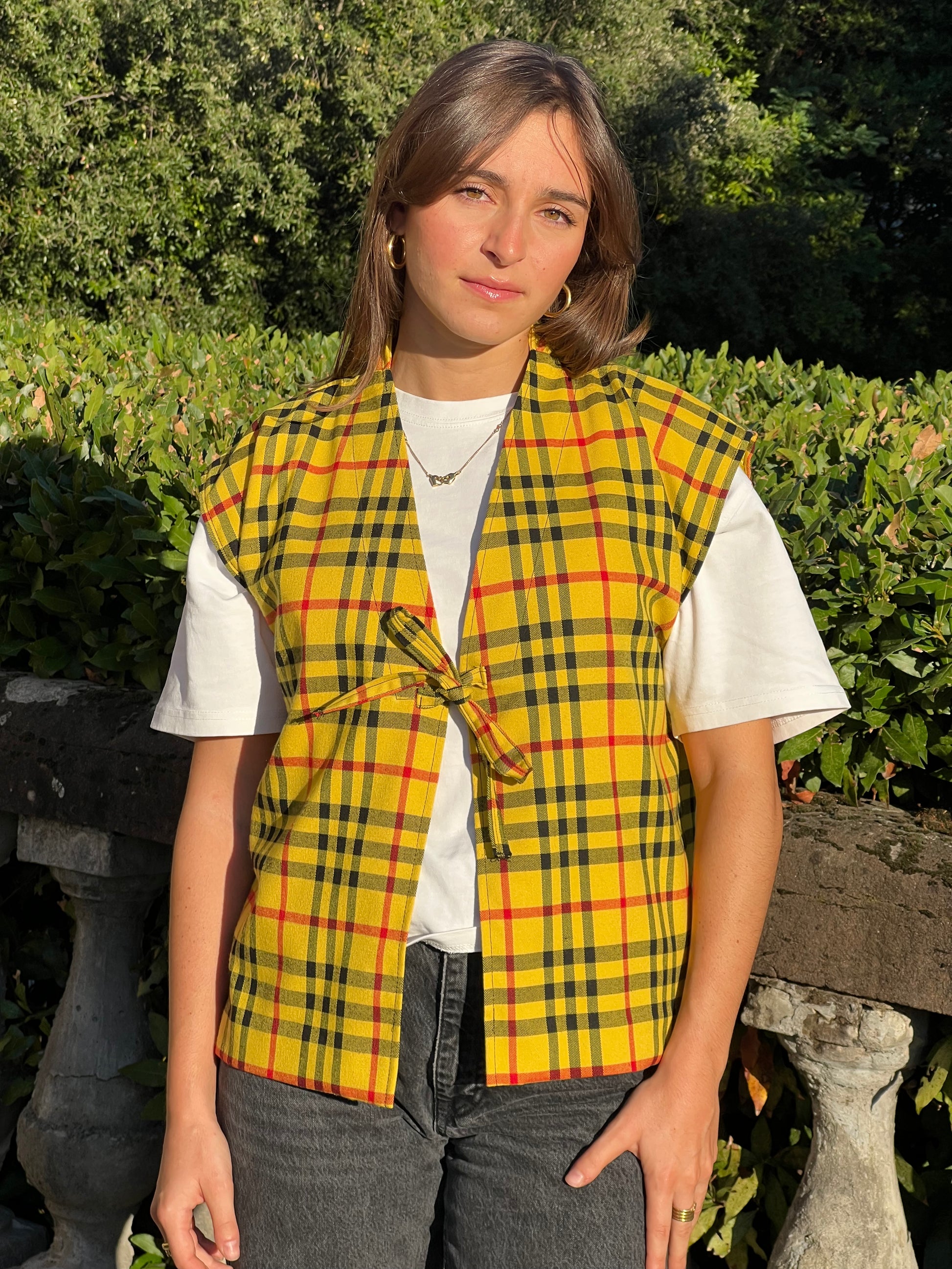 Gilet smanicato tartan con fiocco